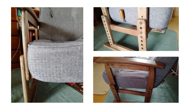 背もたれが高い。170センチ近い父の背中をすっぽり支える。肘かけはいい具合にカーブしていて、腕を置く角度が自然だ。立ち上がり動作も腰掛ける動作もしやすそう。座面はしっかり厚みがあり、長時間座っても疲れにくそう。